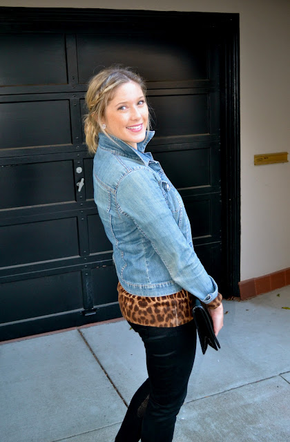 | GAP Jean Jacket (similar), F21 Leopard Sweater (similar), TJ Graziano Necklace (similar), J.Crew Riding Pants (similar), Banana Republic Clutch (similar) Photo Credit: TJC |